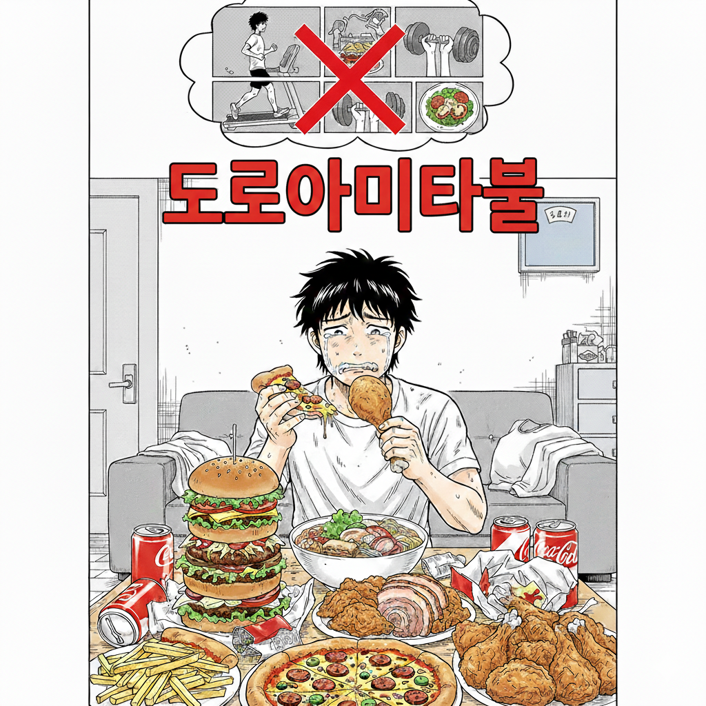 체중을 감량하기 위한 지난 한 주간의 노력이 오늘 한 끼 푸짐한 식사로 “도로아미타불”이 되었다.
