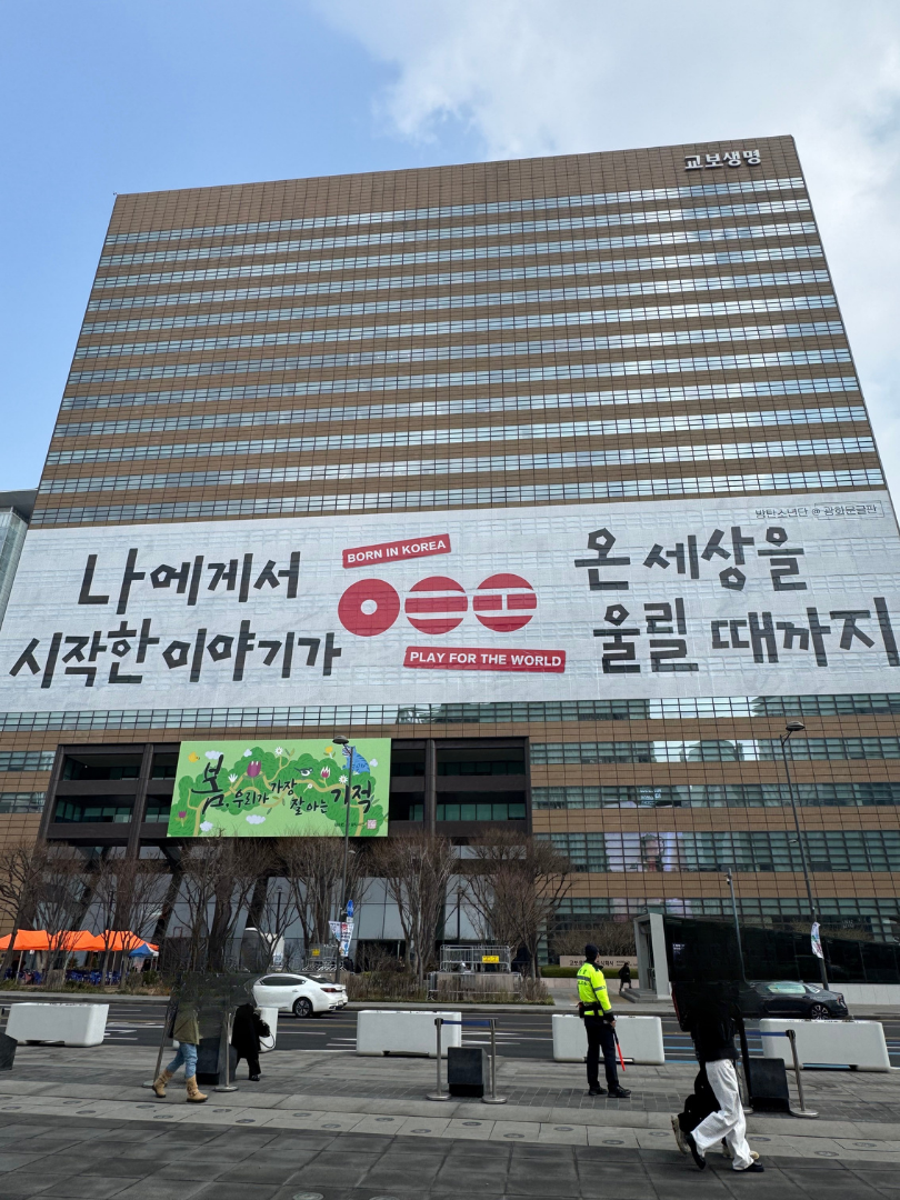 젊은 세대의 생각과 고민을 담은 음악으로 전 세계 팬들에게 사랑받아 온 BTS의 컴백 공연에 대한 기대감은 점점 커지고 있다. 공연이 얼마 남지 않은 지금, 광화문 일대에는 공연을 기념하는 다양한 조형물들이 설치되어 분위기를 더욱 고조시키고 있다.