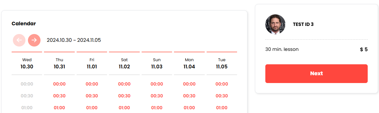 If you click the Find a Tutor page's Book a Trial Lesson button, you will be taken to the page to book a lesson. On this page, you will see the lesson schedule for the week starting today, from which you can select the schedule you would like. If you're going to take a lesson in two or three weeks’ time, you can click the arrow button to check the schedule for those weeks. Select your desired schedule and click the Next button on the right to proceed to the payment page.