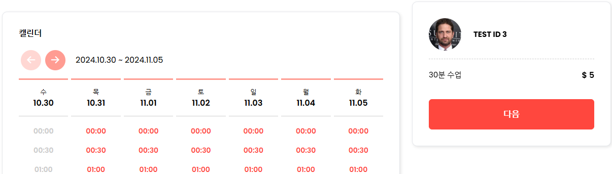 Find a Tutor 페이지에서 체험 수업 예약하기버튼을 클릭하면 수업을 예약하는 페이지로 넘어갑니다. 이 페이지에서는 금일부터 시작하는 한 주의 수업 일정표가 보이고, 당신은 이 일정표에서 당신이 원하는 일정을 선택할 수 있습니다. 만약 두 주나 세 주 후에 수업을 받기 원하는 경우 화살표 버튼을 눌러 다음주 또는 그 다음주의 일정표를 확인할 수 있습니다. 일정표에서 원하는 일정을 선택 후 우측의 Next 버튼을 누르면 결제 페이지로 넘어갑니다.