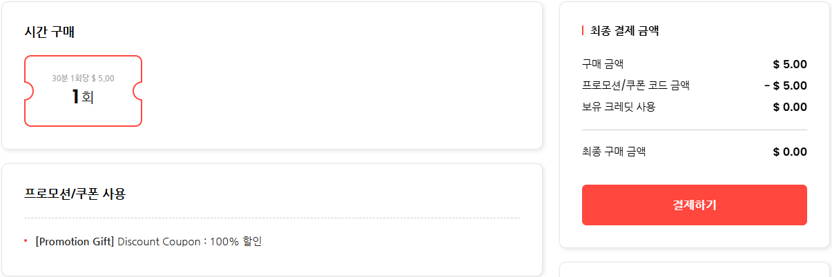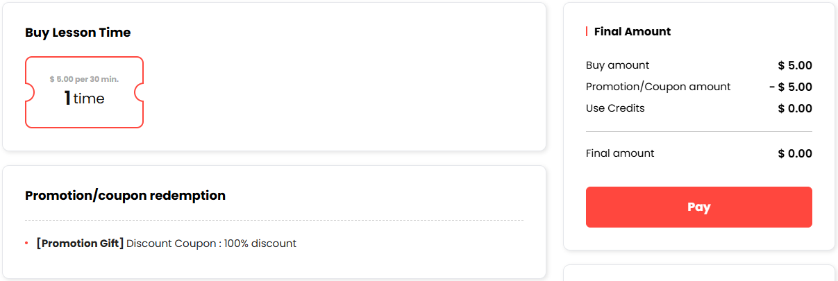 체험 수업의 결제 페이지에서는 30분 수업에 대한 시간 구매만 할 수 있습니다. 만약 당신의 계정에 크레딧이 남아 있을 경우, 당신의 크레딧을 우선 사용하여 결제가 진행될 것입니다. 만약 당신의 계정에 남아있는 크레딧 잔액이 트라이얼 수업료보다 클 경우, 수업료 전체가 크레딧으로 지불되고 예약이 완료될 것입니다.