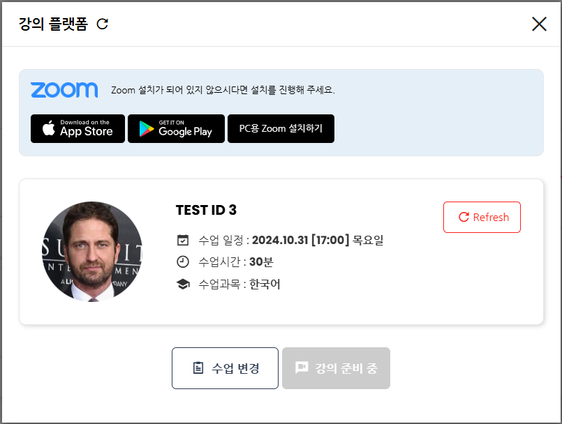 ※주의: 수업 시작 5분 전에 레슨 플랫폼을 리프레시 하십시오. 수업 준비 중 버튼은 자동으로 수업 참여하기로 변경되지 않습니다. 레슨 플랫폼 상단의 리플레시 버튼을 누르면 수업 참여하기 버튼이 나타날 것입니다.