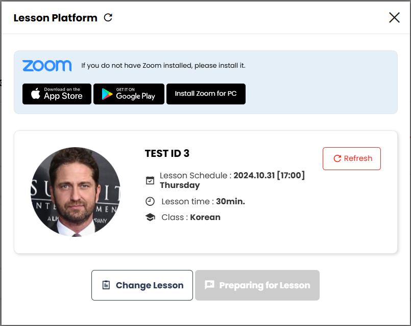 ※Caution: Please refresh the Lesson Platform 5 minutes before the lesson starts. The Preparing Lesson button does not automatically change to Join Lesson. The Join Lesson button will appear when you press the refresh button at the top of the Lesson Platform.